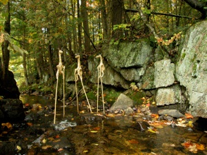 Je destine mes Cerfs articulés à des installations dans des ruisseaux avec témoignages photographiques. En plus de la surprise de voir ces figures qui arpentent les torrents, mon propos est maintenu car mes cerfs deviennent des explorateurs des courants de pensée qu’ils croient allégoriquement voir dans chaque torrent.